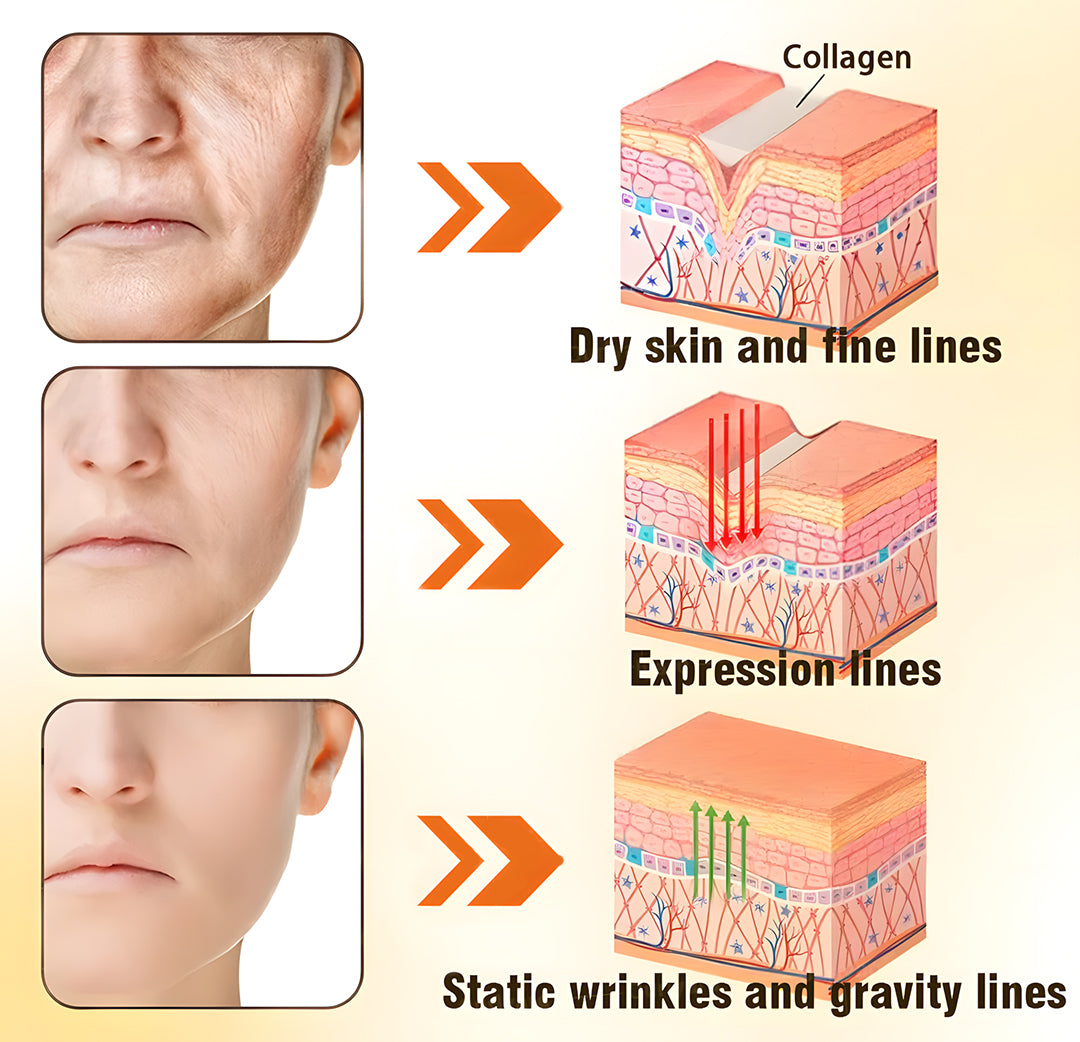 Static and Gravity Lines: When the skin’s "support structure"—collagen and elastin fibers—begins to deplete, gravity gradually pulls the skin down, creating static wrinkles. This is why our jawline can lose definition, and the skin on our neck and décolletage becomes saggy.