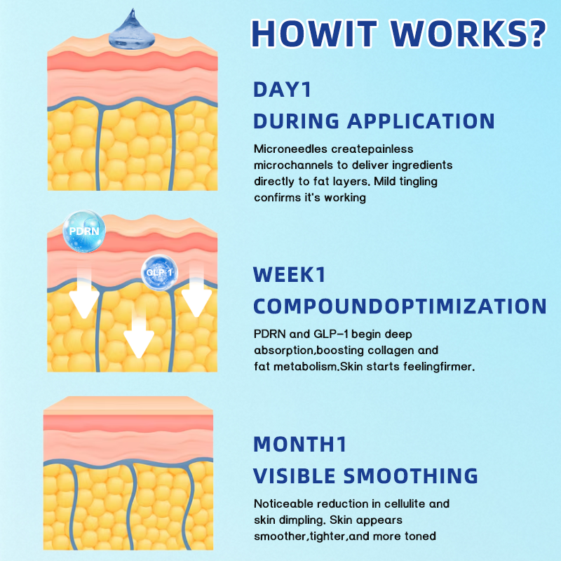 "Negusy™ PDRN-GLP-1 Microneedle Fat-Reduction Gel offers a clinically proven solution for reducing cellulite. Its advanced microneedle technology significantly enhances transdermal absorption, allowing PDRN and GLP-1 to target the subcutaneous fat layer where they are most effective. My patients have seen noticeable improvements in skin texture and firmness within weeks."