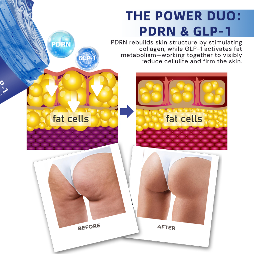 PDRN strengthens and rebuilds skin, while GLP-1 targets fat metabolism. Together, they deliver a powerful combined effect—clinical studies reveal an 89% cellulite improvement, compared to 34% for PDRN alone and 41% for GLP-1 alone.