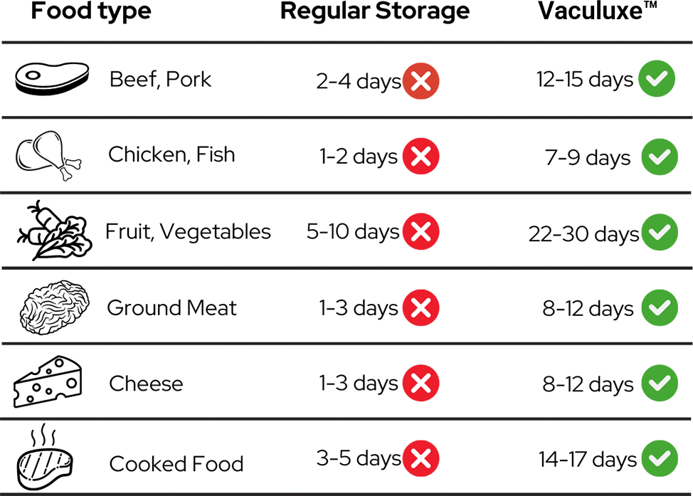 Vaculuxe™ will extend the shelf life of your food up to 5 times, whether stored in the fridge, freezer, or pantry.